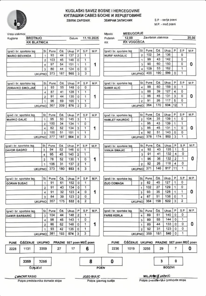 KK Blatnica – Međugorje | 8 | 3359 | 17 | 7 | Pobjeda |