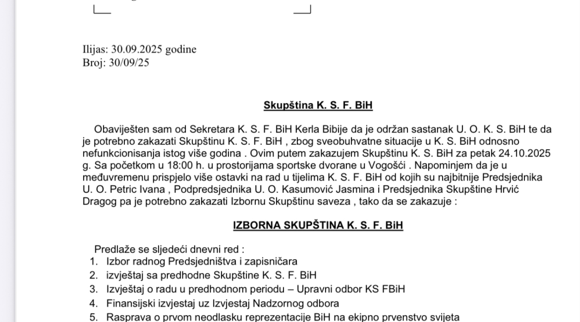 Skupština će biti održana u petak, 24. oktobra 2025. godine, s početkom u 18:00 sati, u prostorijama sportske dvorane u Vogošći.