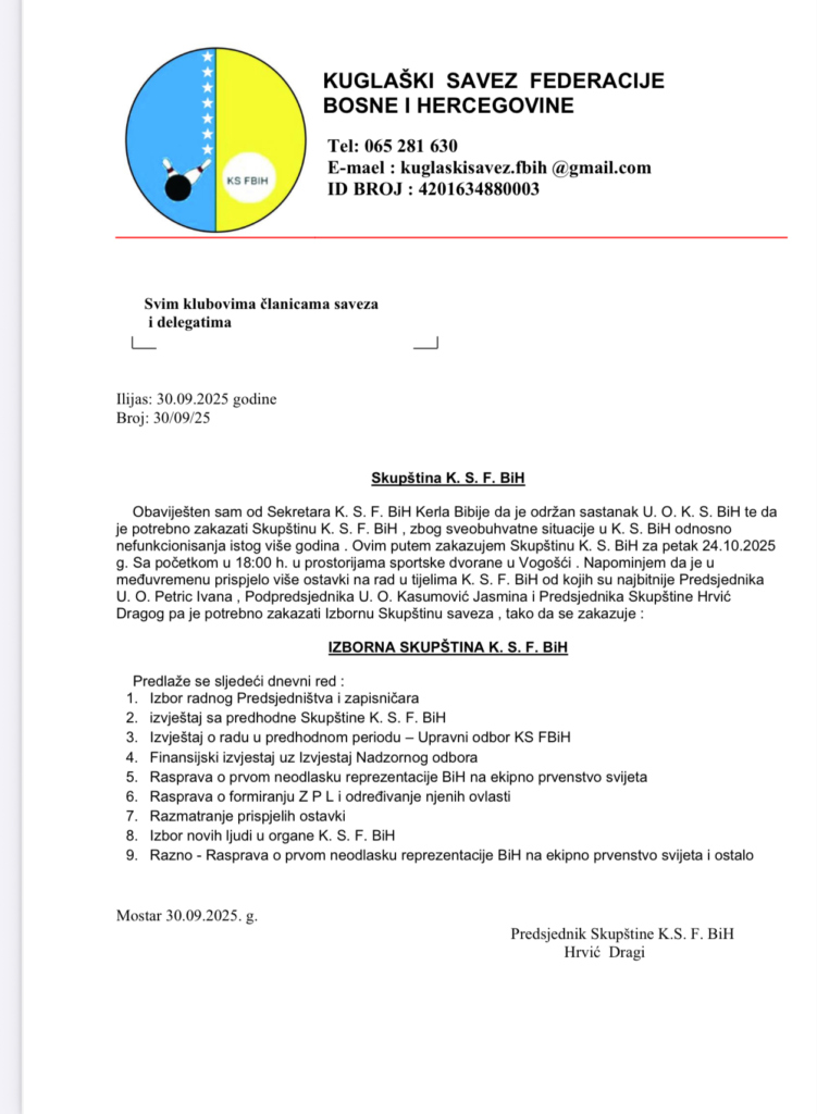 Na osnovu obavijesti Sekretara Kuglaškog saveza Federacije BiH, Bibije Kerla, da je održan sastanak Upravnog odbora KS FBiH, donesena je odluka da se zbog višegodišnjeg nefunkcionisanja Saveza zakaže Skupština KS FBiH.